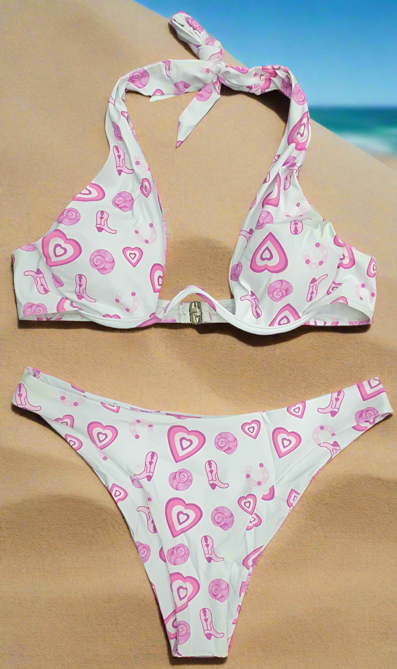 طقم بيكيني أنيق من قطعتين بطبعة زهور نابضة بالحياة. يتضمن الجزء العلوي المثلث الكلاسيكي وسروالًا متناسقًا مع أربطة جانبية.