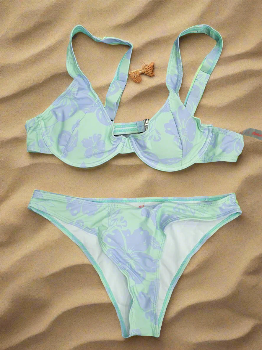 طقم بيكيني أنيق من قطعتين بطبعة زهور خضراء فاتحة وأرجوانية. يتضمن الطقم حمالة صدر داعمة وجزءًا سفليًا متناسقًا.