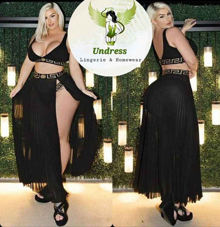 طقم أنيق من ثلاث قطع باللون الأسود بتصميم منقوش ذهبي. يتضمن بلوزة وسروالًا داخليًا وتنورة طويلة مطوية بفتحة جانبية.