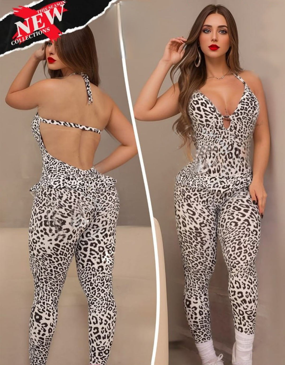 أظهري أناقتكِ الجريئة مع هذه الجمبسوت من قطعة واحدة بطبعة جلد النمر. تتميز بفتحة رقبة هالتر جذابة، وفتحة على شكل مفتاح، وتصميم جريء مفتوح من الخلف، مثالية لإطلالة عصرية واثقة.