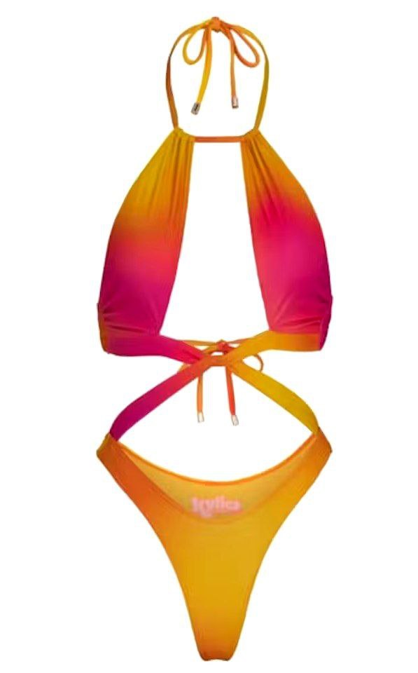 بدلة سباحة أنيقة من قطعة واحدة بتأثير أومبري نابض بالحياة، يمتزج فيه اللون الأصفر مع الوردي. يتميز التصميم بفتحة رقبة بدون أكمام وحمالات متقاطعة على الجذع.