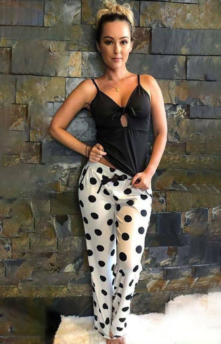 طقم بيجاما مريح من قطعتين، يتضمن قميصًا داخليًا أسود برباط أمامي وبنطالًا واسع الساقين بنفس اللون. يتميز الطقم بطبعة نقاط بولكا كلاسيكية، مثالي للاسترخاء في المنزل.