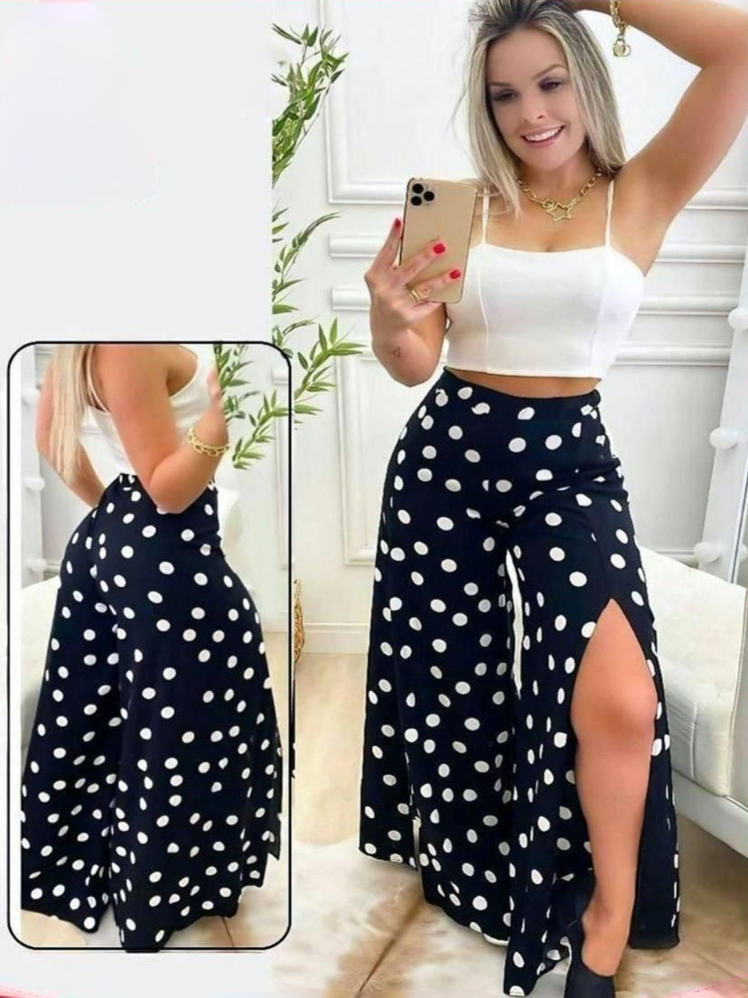 طقم أنيق من قطعتين، يتضمن بلوزة بيضاء قصيرة وبنطالًا واسعًا بخصر عالٍ. البنطال أسود اللون بطبعة نقاط بيضاء وفتحة جانبية لإطلالة أنيقة ومريحة.