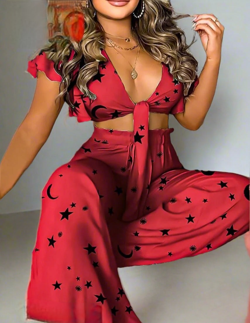 طقم أنيق أحمر اللون من قطعتين بنقشة نجوم وقمر سوداء فريدة. يتضمن الطقم بلوزة قصيرة برباط أمامي وبنطالًا واسعًا بخصر عالٍ.