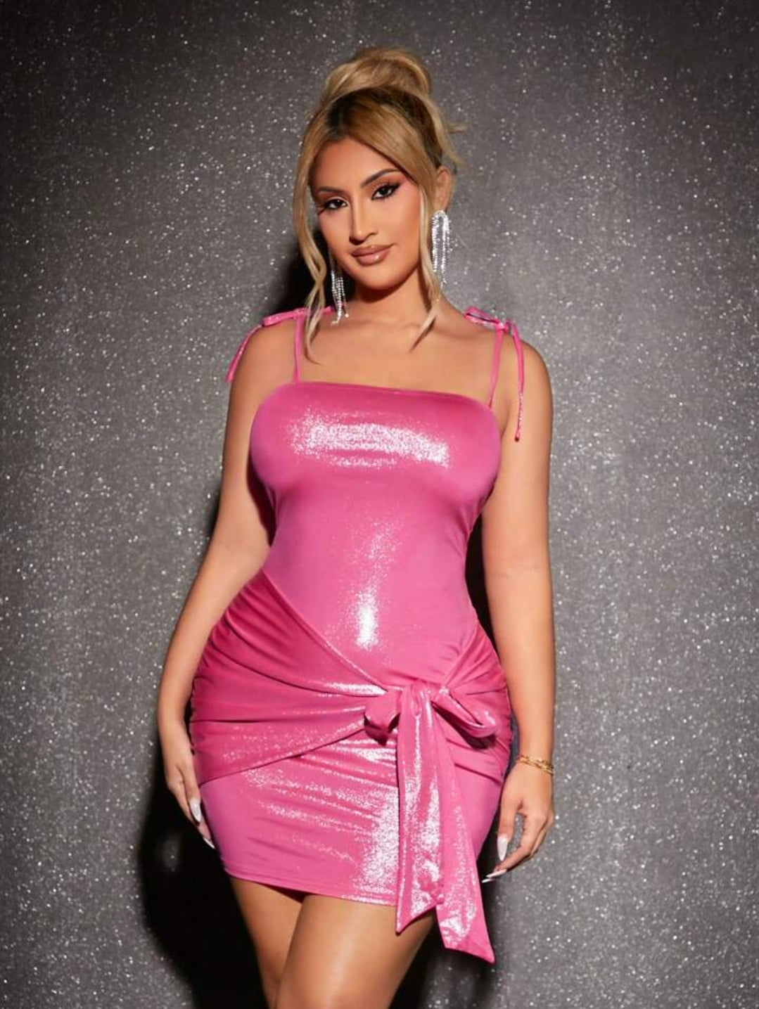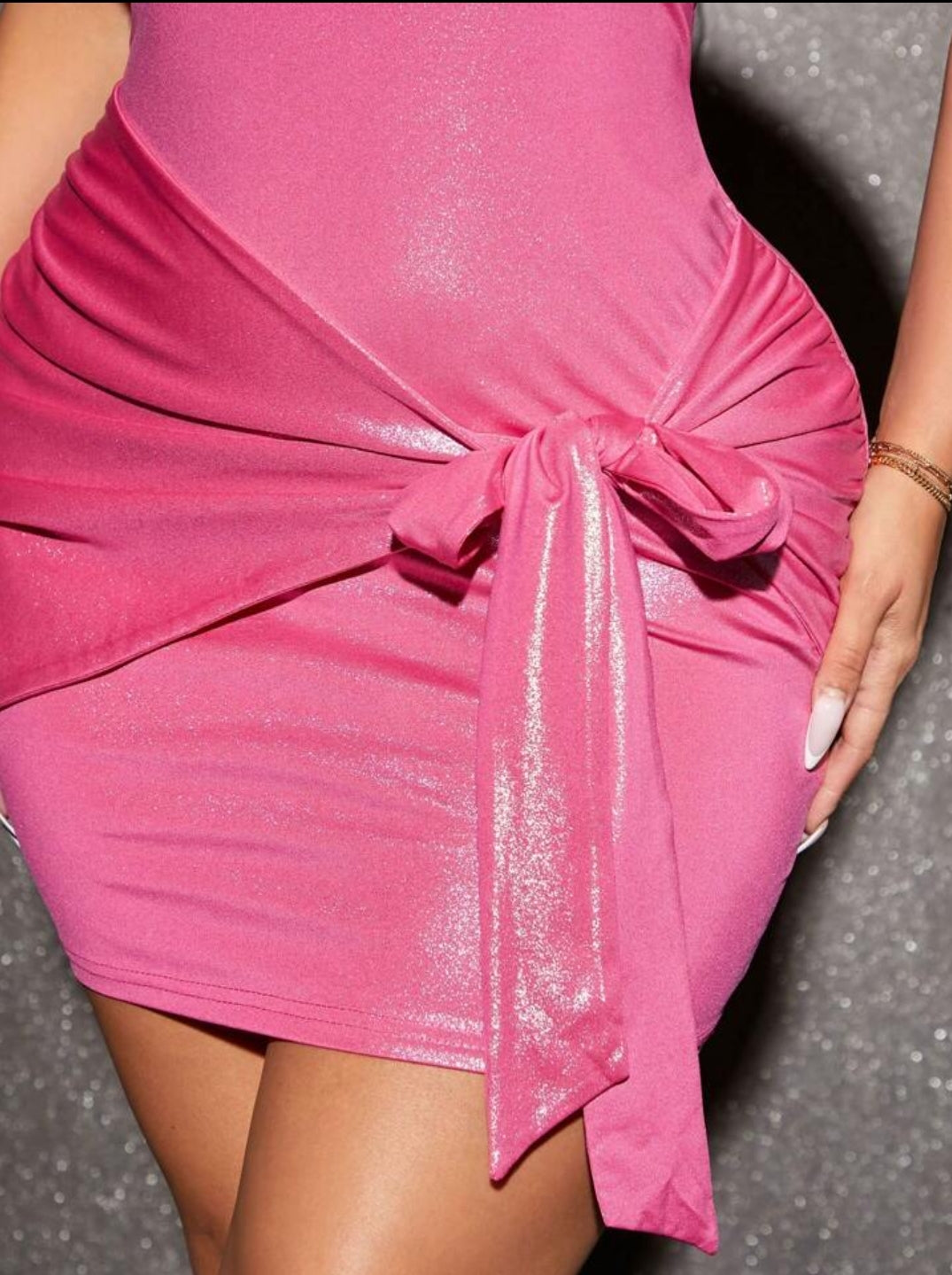 فستان قصير أنيق وجذاب بلون وردي فاقع ولمسة نهائية لامعة. يتميز بتصميم مكشكش ضيق مع رباط خصر فريد لإطلالة عصرية وأنيقة.