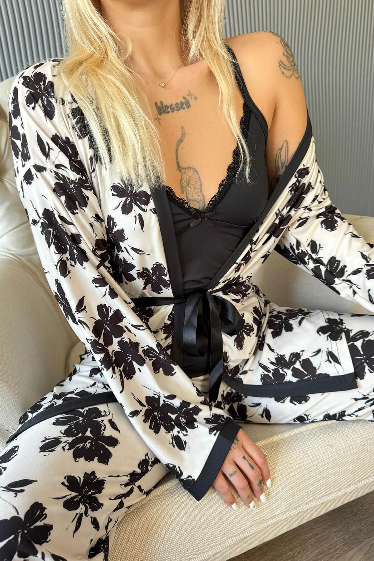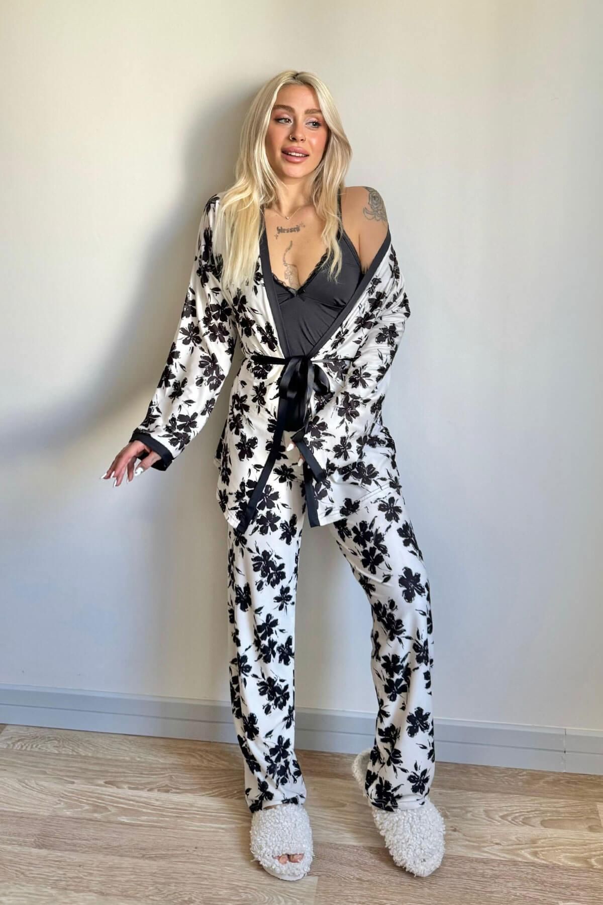 طقم بيجاما مريح وأنيق من ثلاث قطع، يشمل رداءً، وقميصًا داخليًا، وبنطالًا واسع الساقين متناسقًا. يتميز الطقم بطبعة زهور كلاسيكية باللونين الأبيض والأسود، مما يجعله مثاليًا لإطلالة منزلية مريحة وأنيقة.