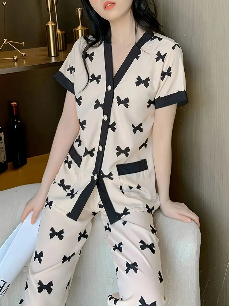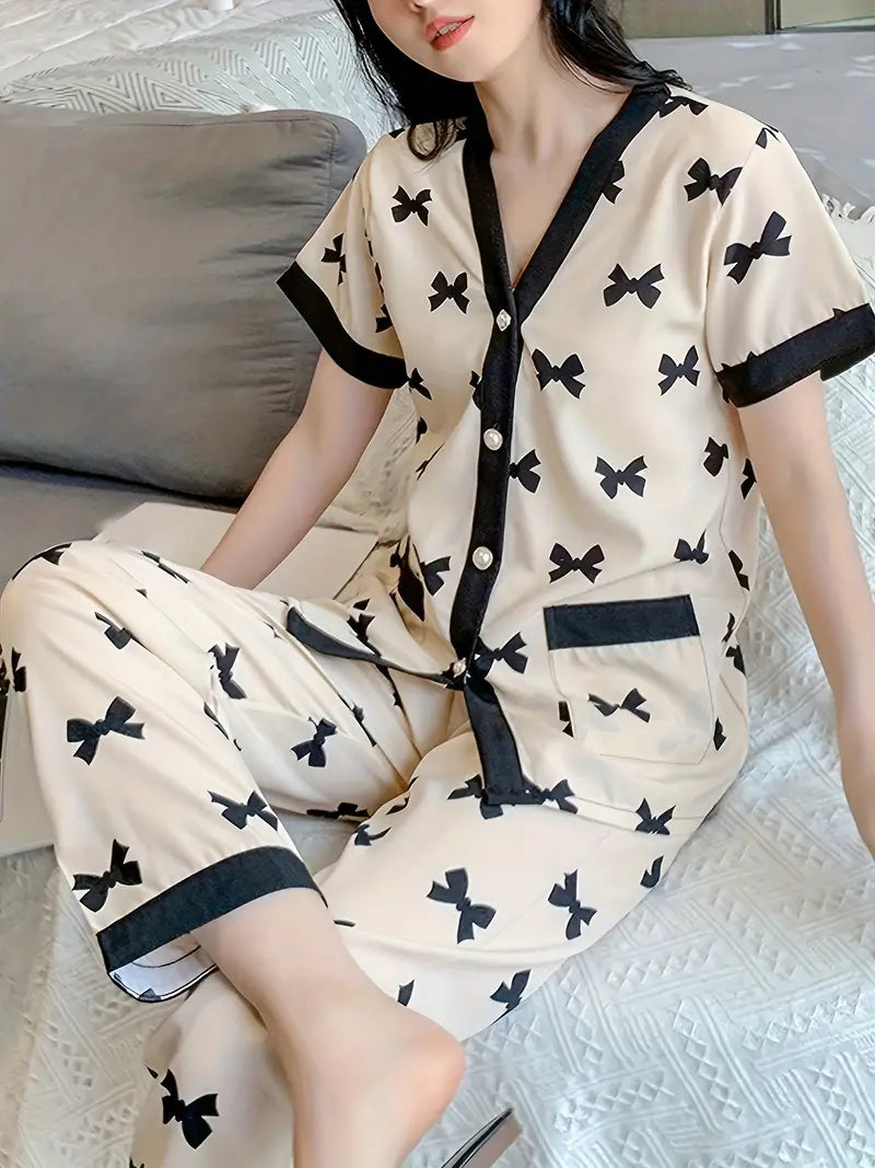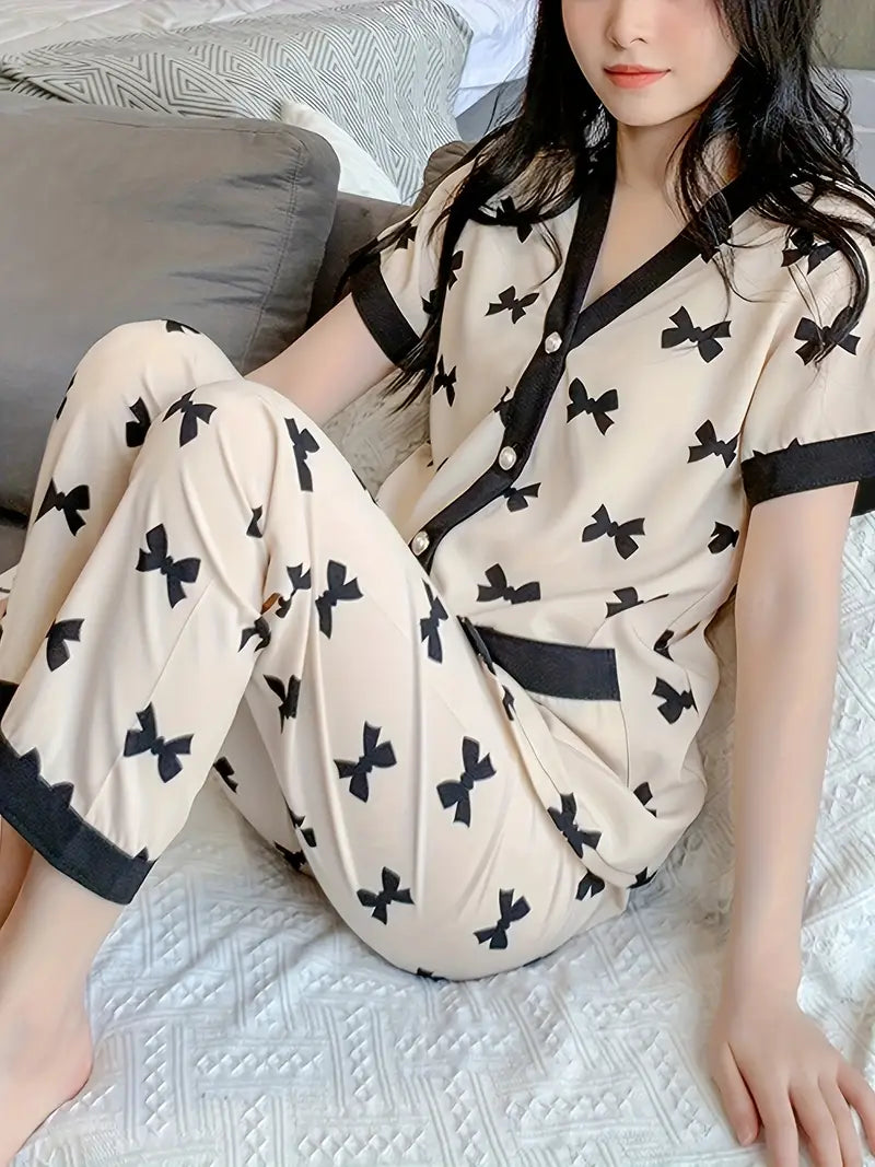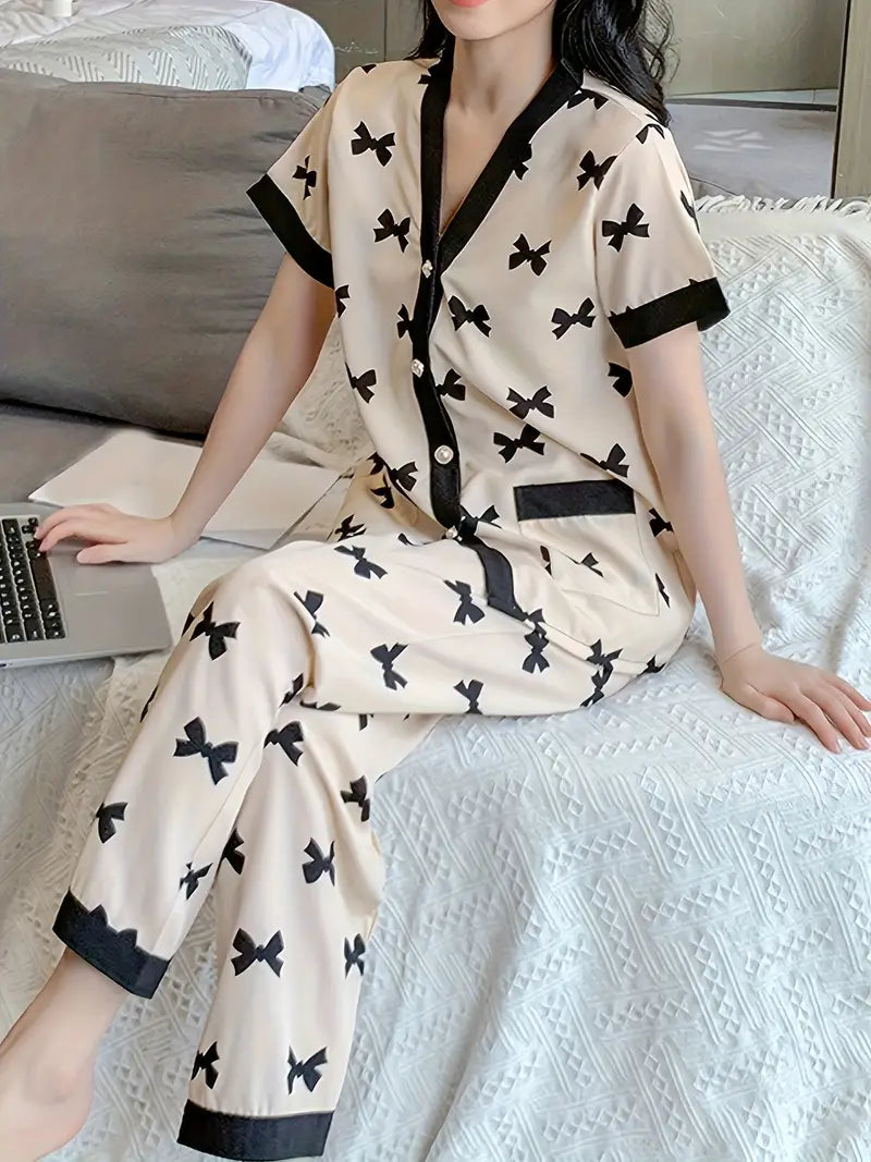 طقم بيجاما أنيق ومريح من قطعتين. يتضمن قميصًا بأكمام قصيرة وأزرارًا وبنطالًا واسعًا بنفس اللون، مزينًا بطبعة فيونكة سوداء جذابة. مثالي لقضاء ليلة مريحة وعصرية.