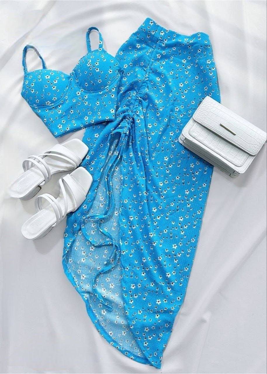 طقم أنيق من قطعتين بطبعة زهور زرقاء فاتحة. يتضمن بلوزة قصيرة بتصميم حمالة صدر وتنورة طويلة متناسقة بفتحة جانبية عالية وكشكشة قابلة للتعديل.