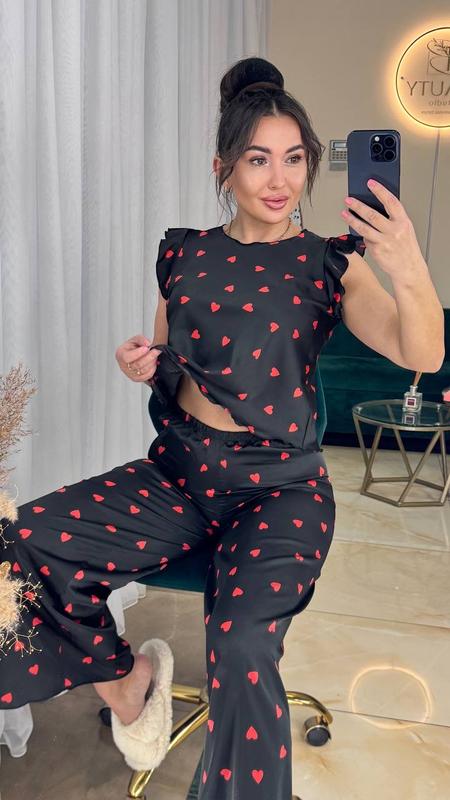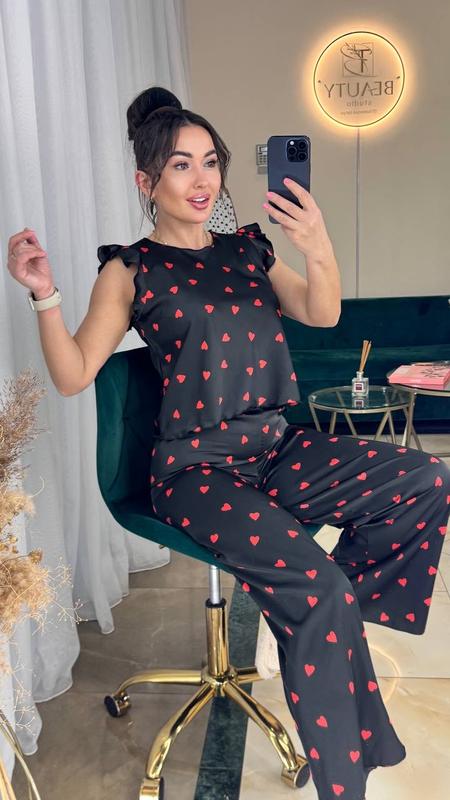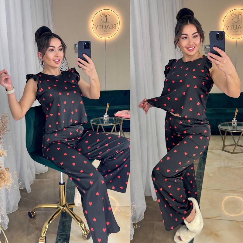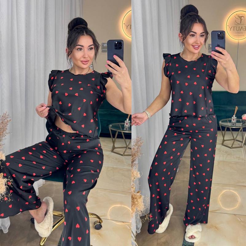طقم مريح وأنيق من قطعتين باللون الأسود بطبعة قلب أحمر. يتضمن الطقم بلوزة أنيقة بأكمام مكشكشة وبنطالًا واسع الساقين متناسقًا، مثاليًا للاسترخاء في المنزل.
