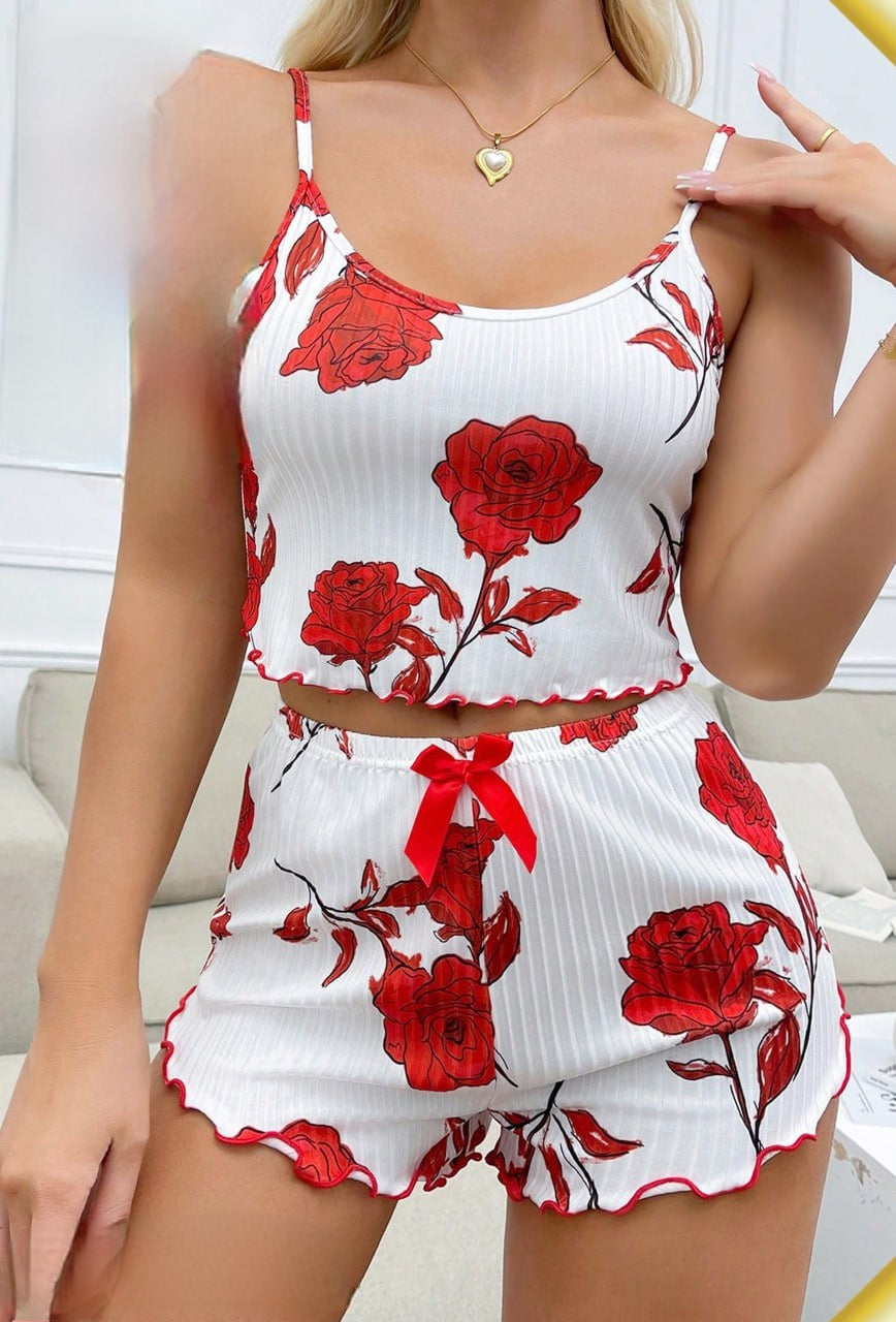 طقم مريح وأنيق من قطعتين، مثالي للاسترخاء. يتضمن هذا الطقم بلوزة بتصميم كاميسول وشورتًا متناسقًا، كلاهما بنسيج مضلع وطبعة وردة حمراء زاهية. يتميز بفيونكة حمراء ساحرة وحواف صدفية لإضفاء لمسة رقيقة.